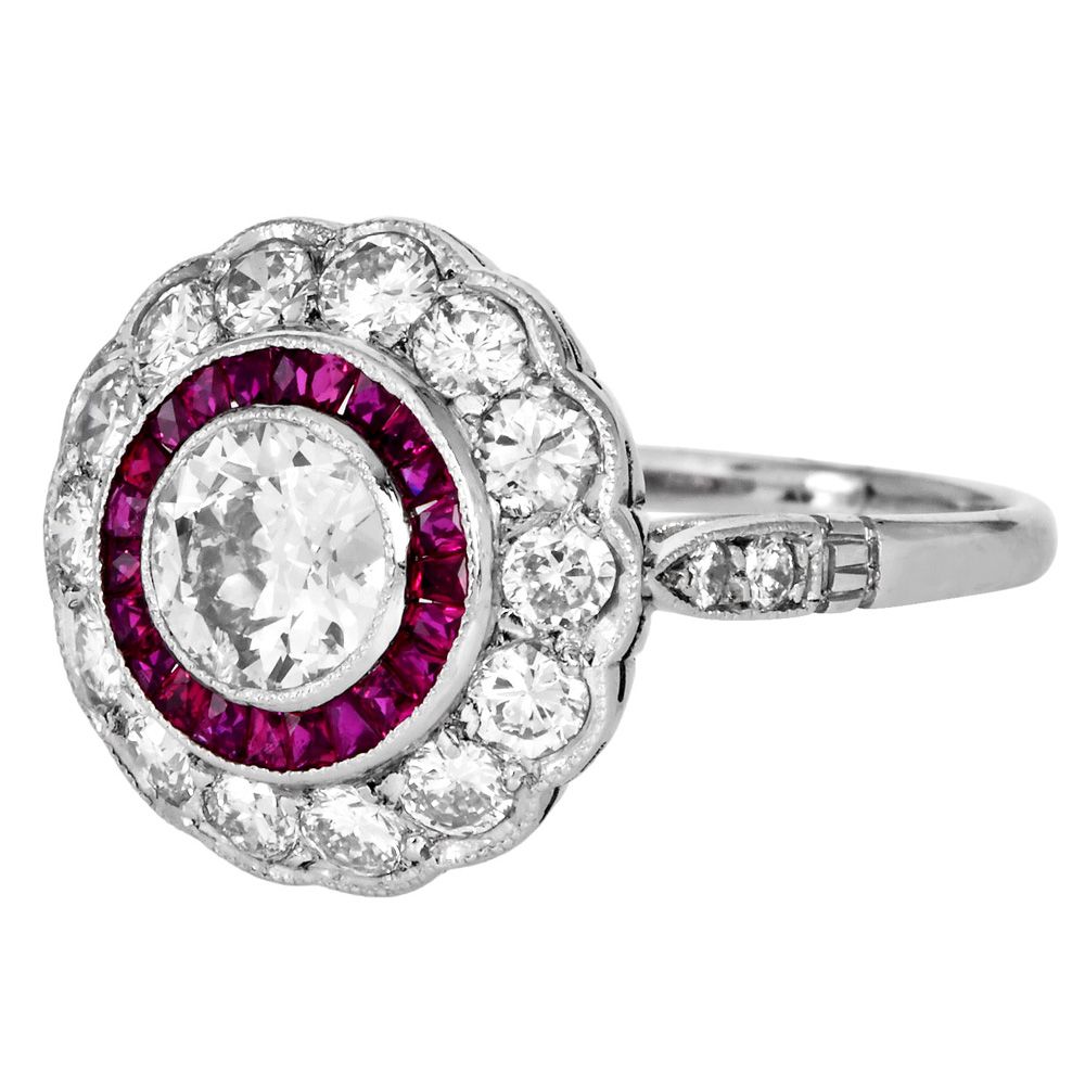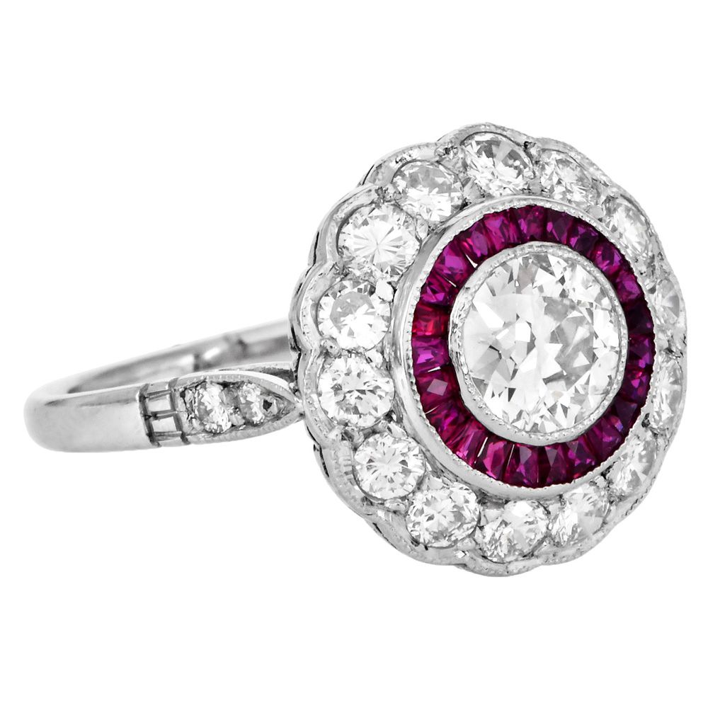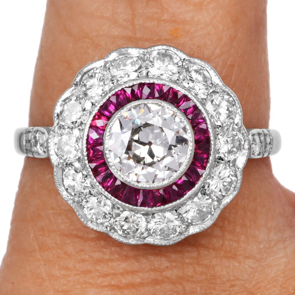 Deco Style European-Cut Diamond French-Cut Ruby Floral Platinum Ring