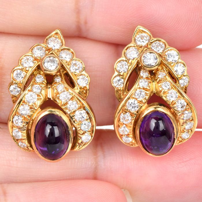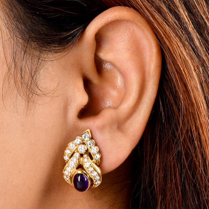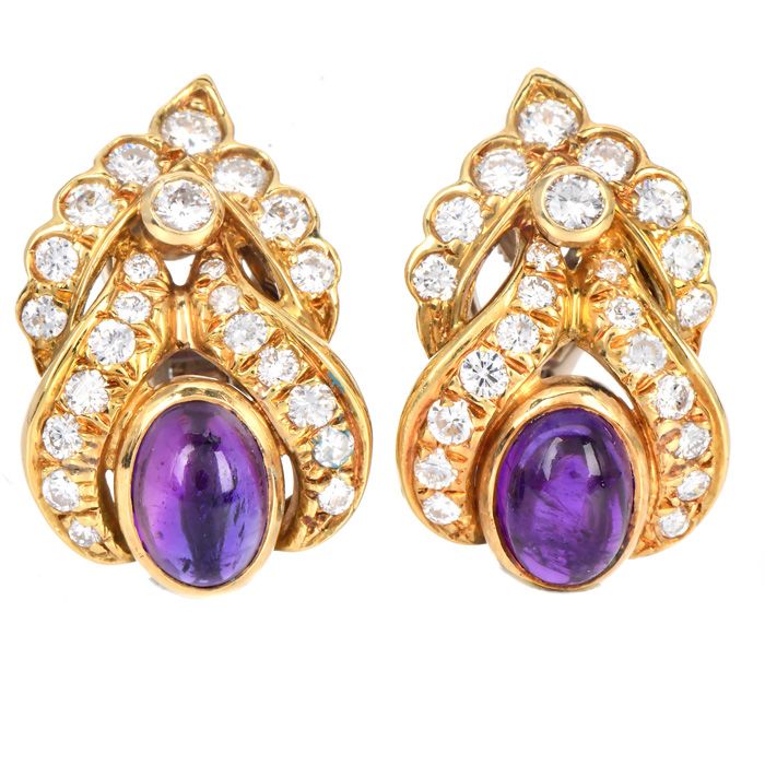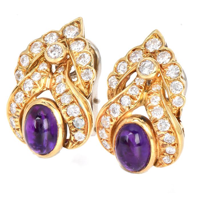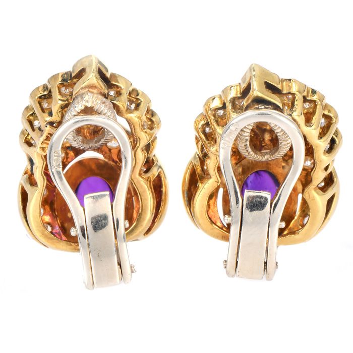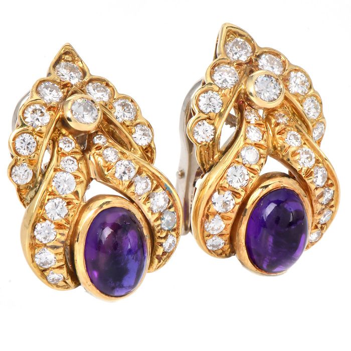 Estate Amethyst 5.70cts Diamond 18K Gold Floral Statement Earrings