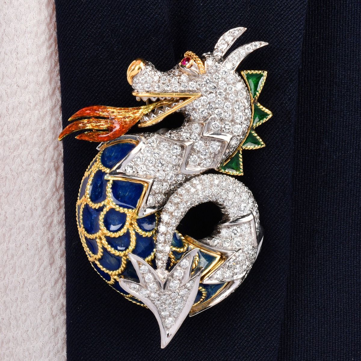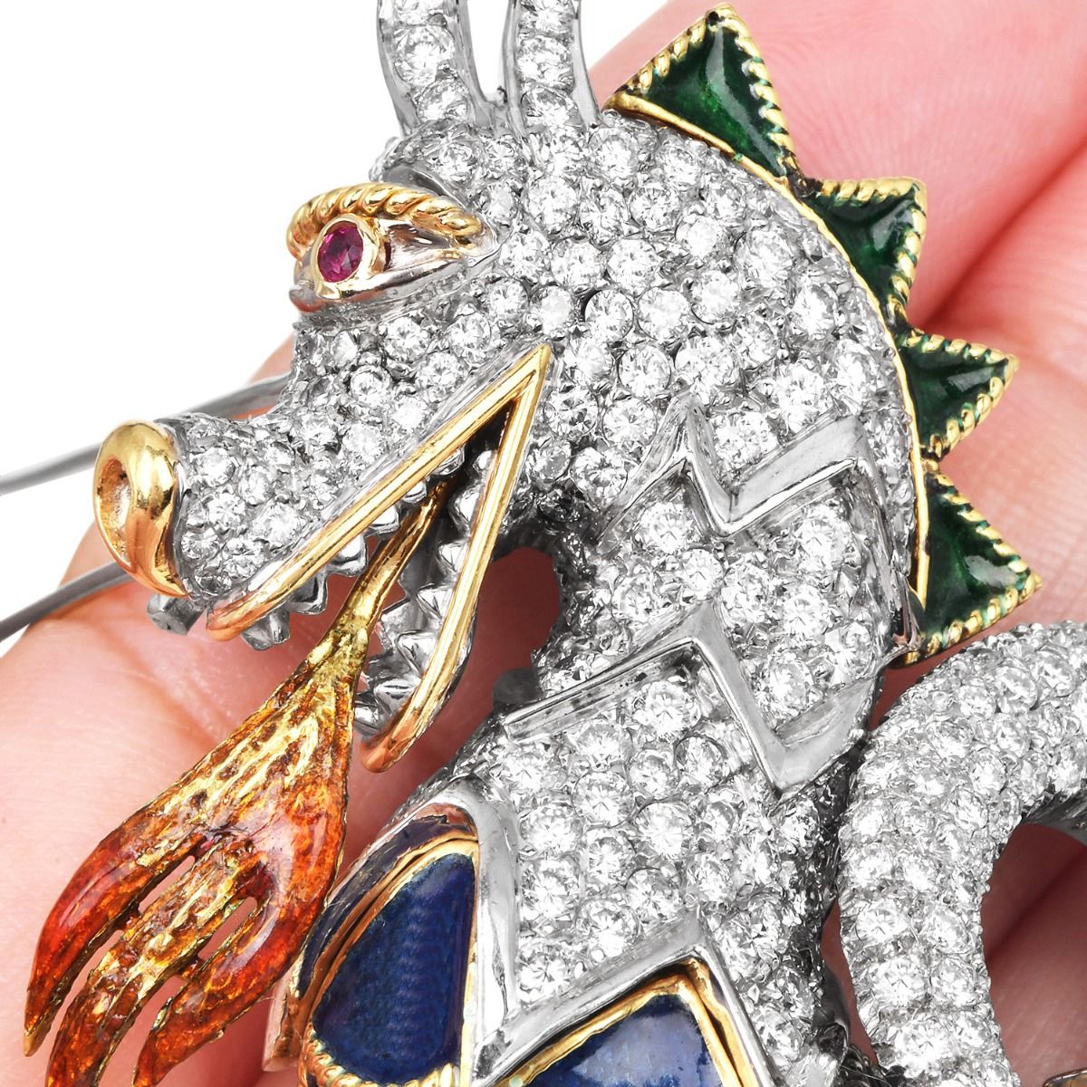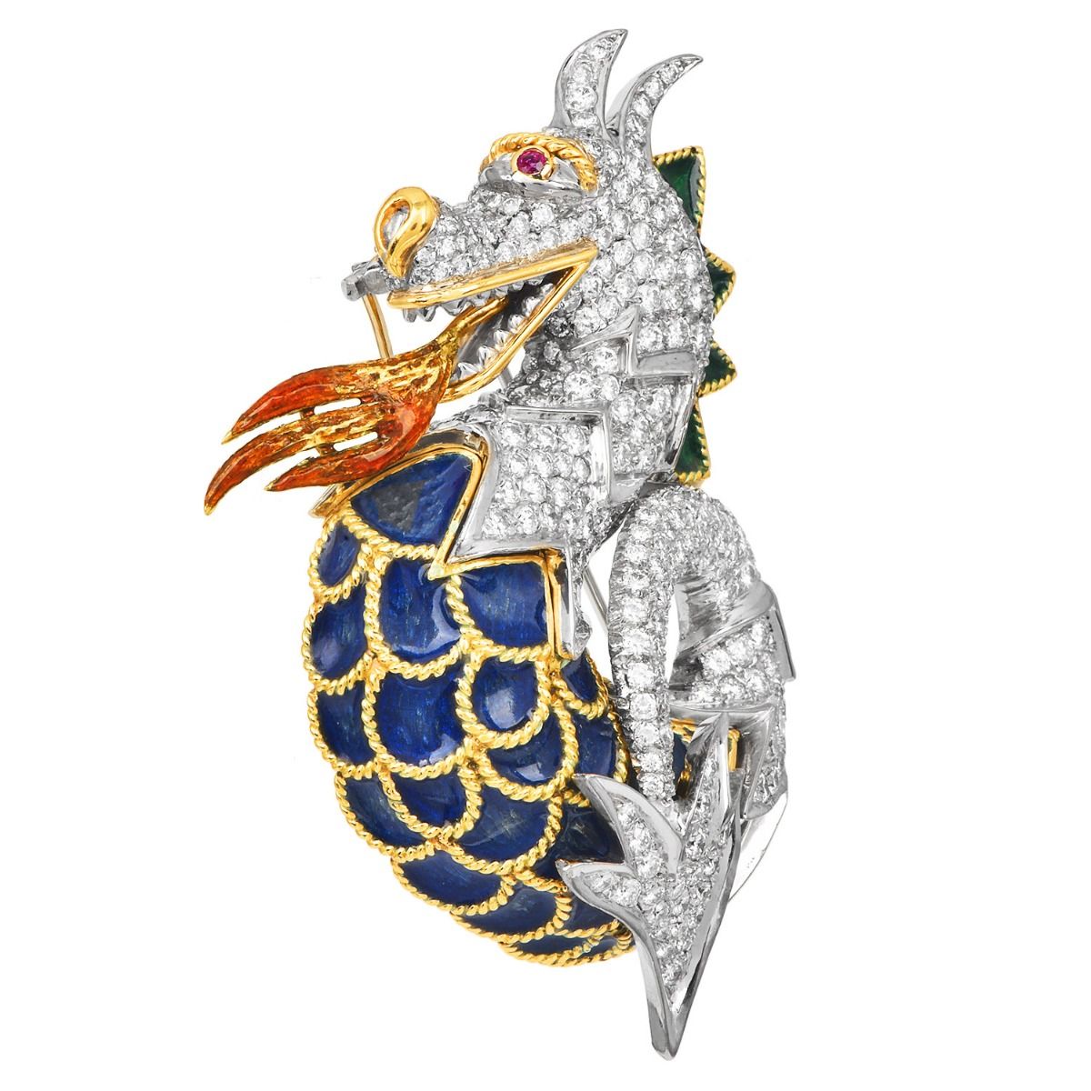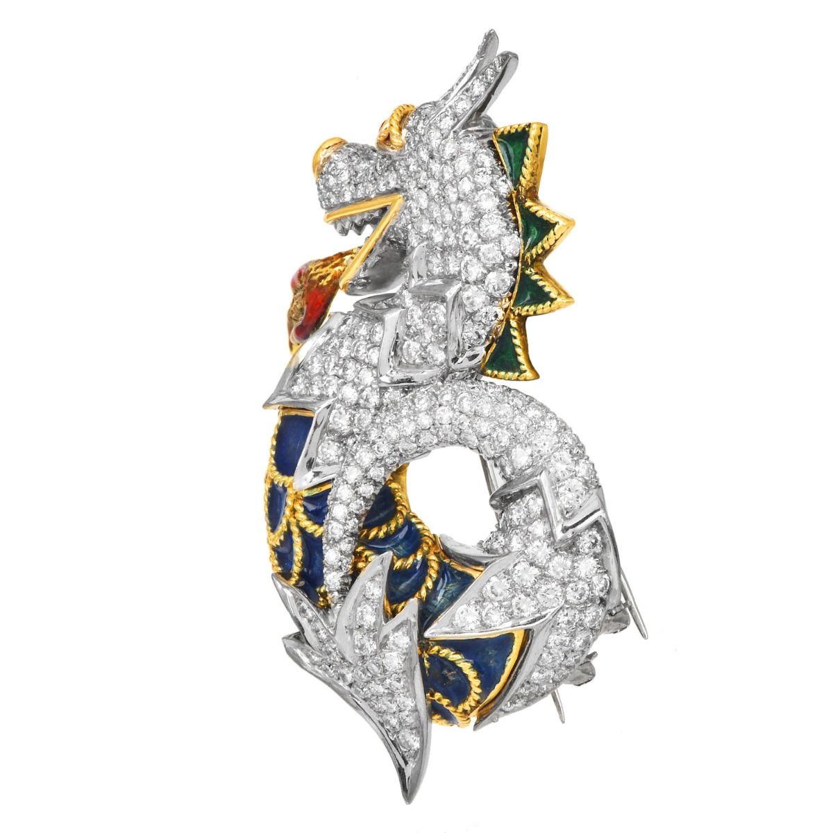 Vintage 18K Gold Dragon Diamond 9.50cts Enamel Brooch Pin