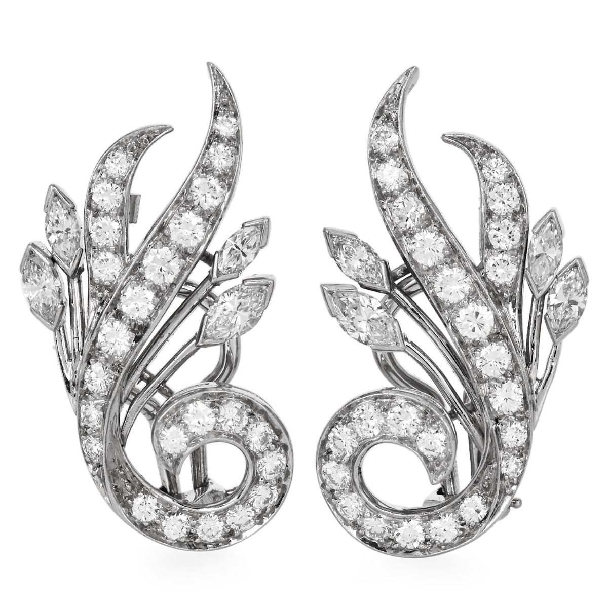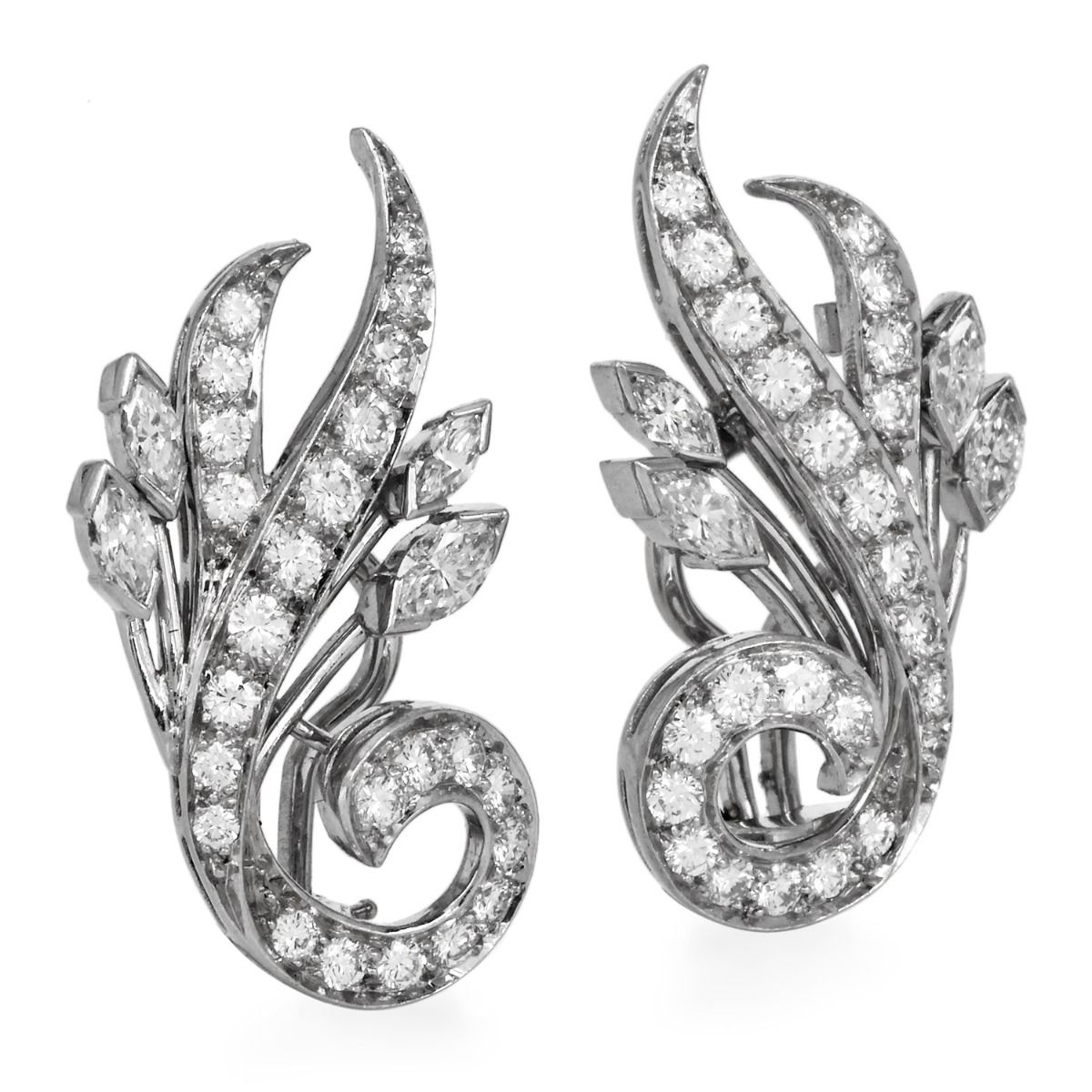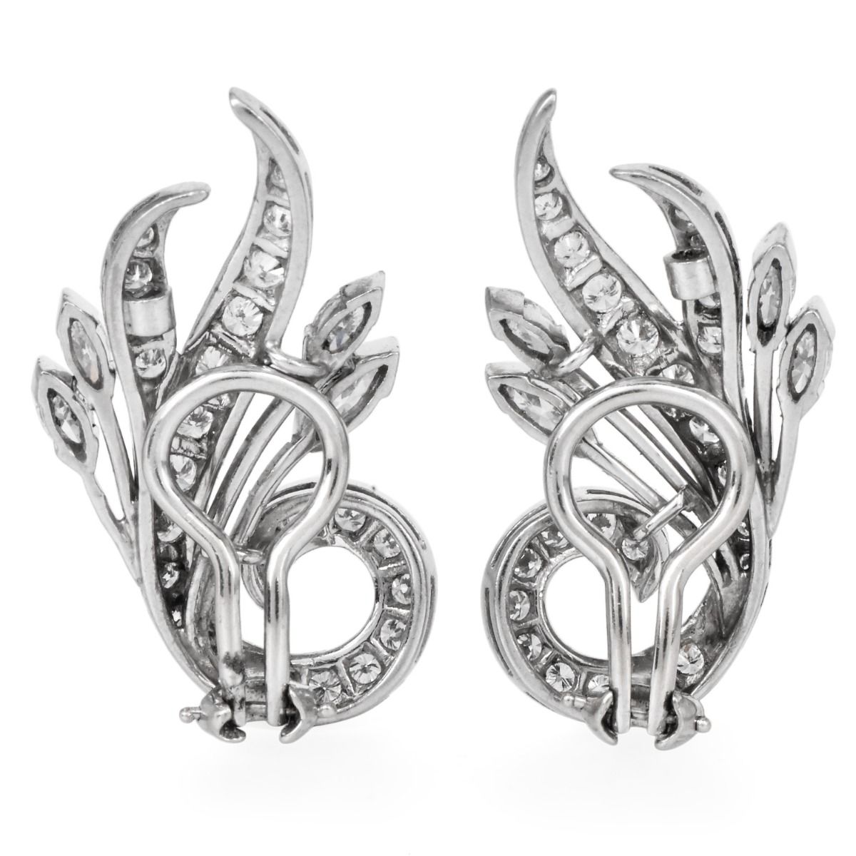 Vintage Deco Platinum Diamond Floral Clip-On Earrings