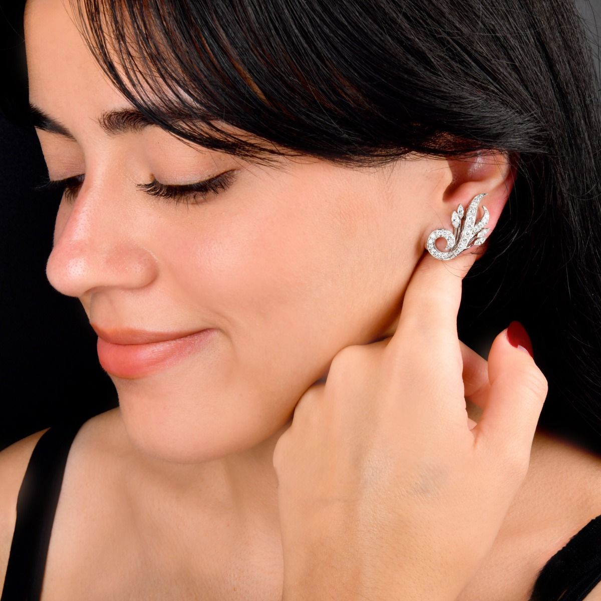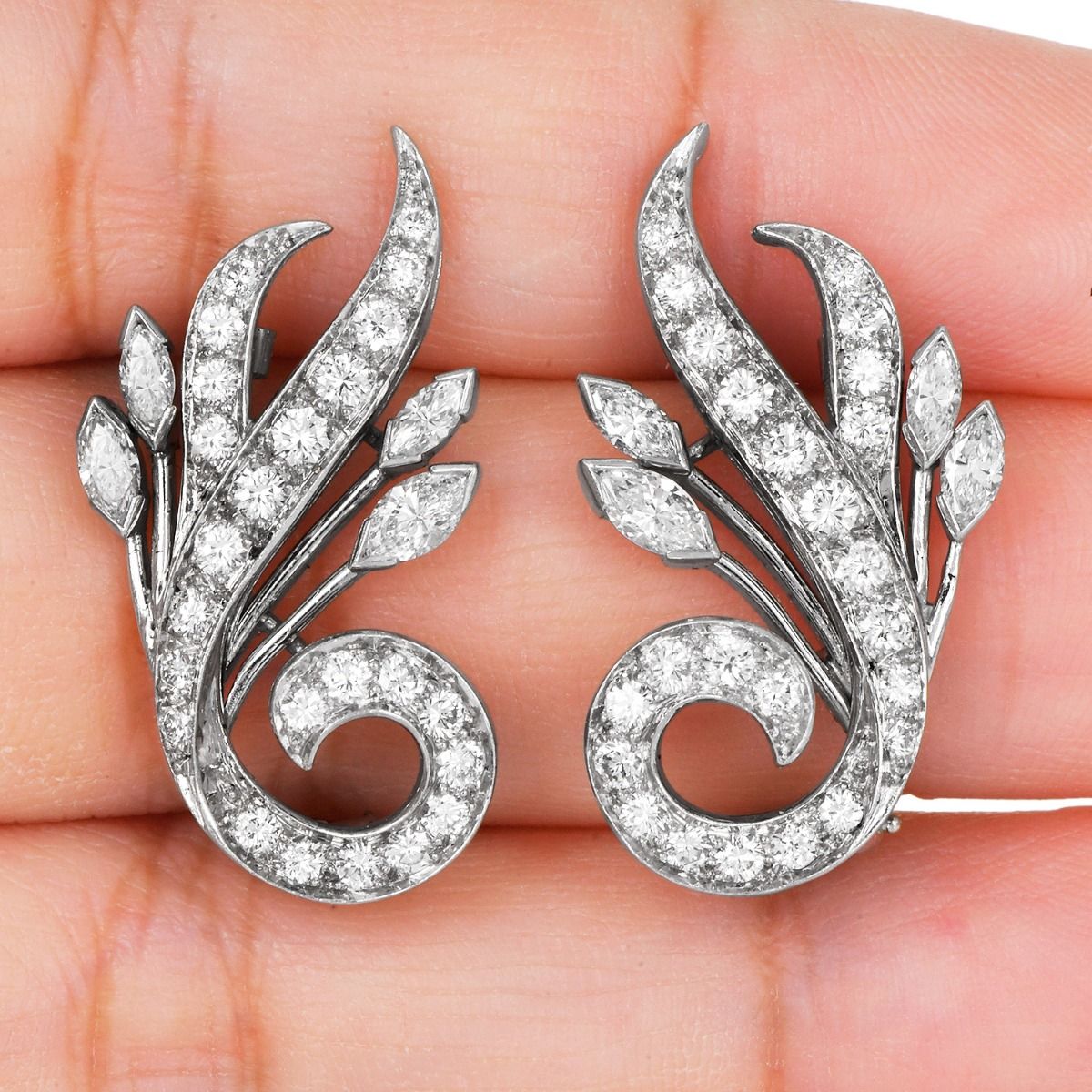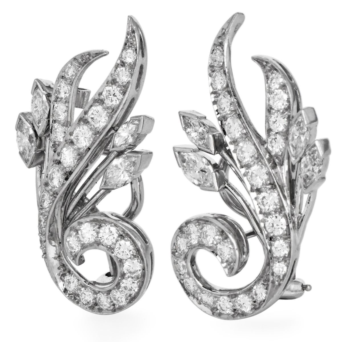 Vintage Deco Platinum Diamond Floral Clip-On Earrings